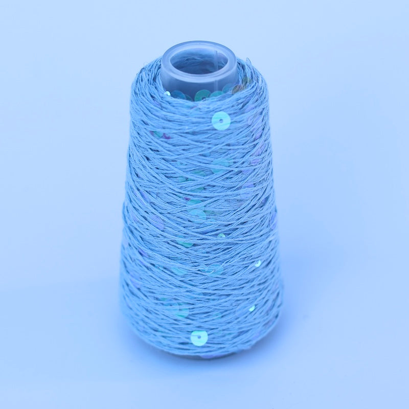 Festive and eye-catching sequin yarn. Sysleriget Sequins is a soft cotton effect yarn adorned with beautiful sequins. It is especially well-suited for holding together with another “hairy” yarn, such as one or more strands of Silk Mohair, Brushed Deluxe, or similar.